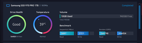 Three different software programs were run to establish benchmarks. The first was the UserBenchmark™, the second Samsung Magician™, and the third the ATTO™. In the tests, Sequential testing replicates reading/writing video and music files, while Random replicates reading from multiple locations like starting up a computer, or where data is stored in available spaces on an existing drive. Deep queue replicates typical server activities. The Kingston KC2500 was compared to a Samsung 970 Pro NVMe M.2 SSD 1TB drive, both inserted in native PCIe M.2 module slots on the motherboard.