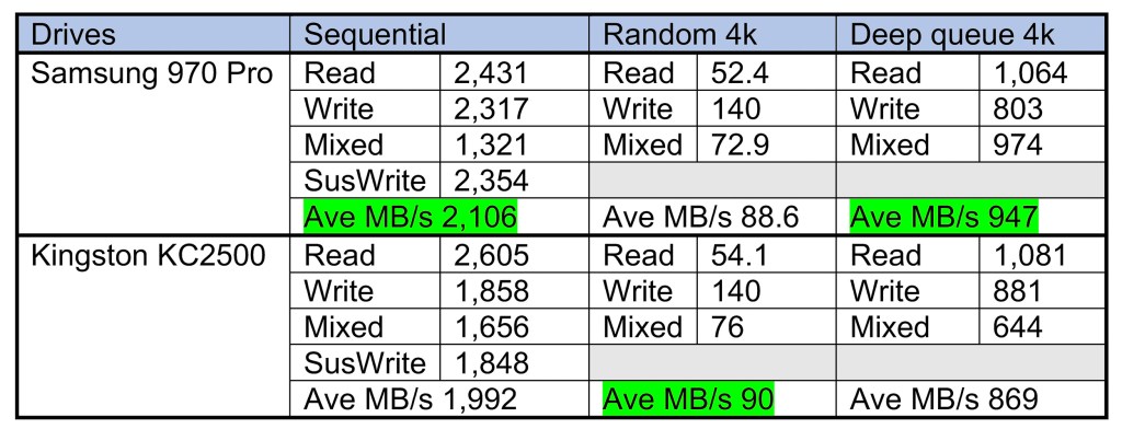 In looking at the UserBenchmark results, the Samsung is faster than the Kingston on most of the sequential tests, while the Kingston is faster than the Samsung on the random tests. The Samsung is faster on two of the three Deep queue tests.