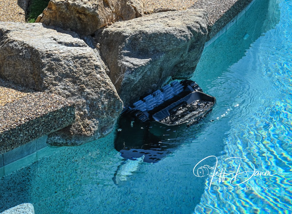 The testing was done in a pool I considered a challenge for it to clean: a 14,000-gallon salt water free-form pool with two sets of steps/landings and attached jetted hot tub.  The pool depth varies from about 3 feet to 5 feet, the walls curve to the bottom and the waterline has several boulders that jut down into the water.