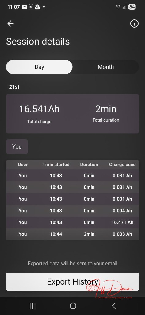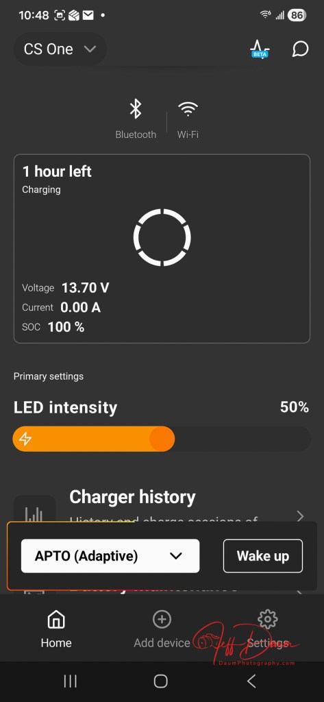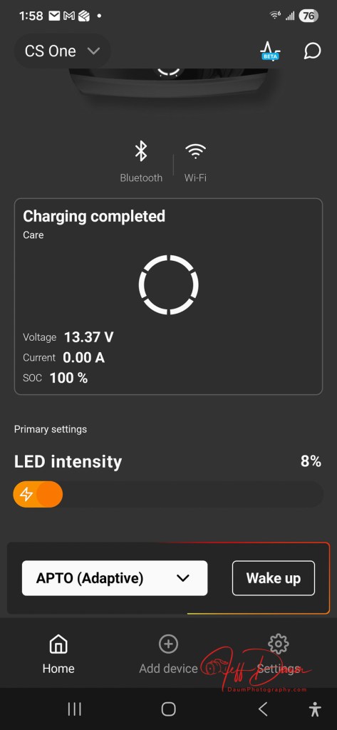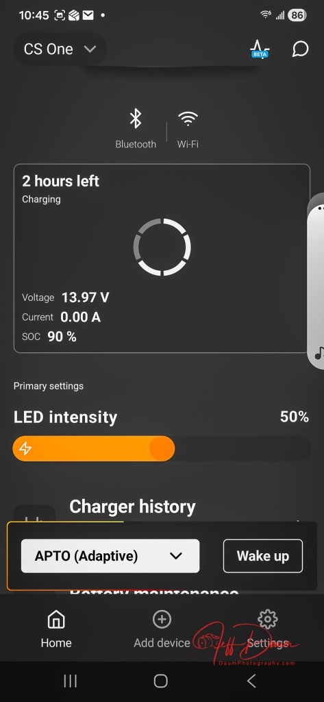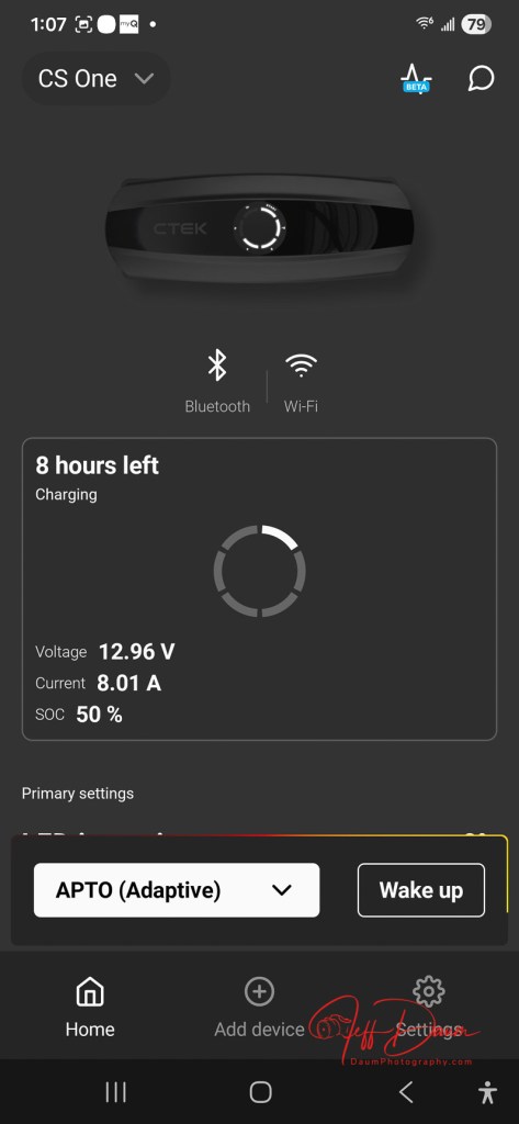 Connecting the free downloaded CTEK App on my Android phone was easy and quick. Following its guidance it quickly found the CS ONE (GEN2).  The app is clear and a snap to use, displaying an animated status of the unit’s connection to the battery.  It also shows other information including voltage, charging current, SOC (state of charge) %, a slider to adjust the unit’s LED brightness, charger history (by specific date or for the month), and option to share the device with others, option to select the charger’s output power (either Adaptive or Maximum), option to change Wi-Fi connection and factory reset.