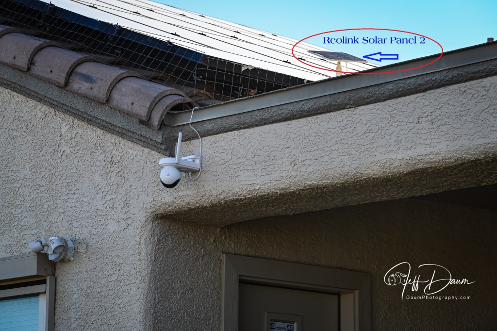 Since I have put the Altas PT Ultra in service for only a few weeks, I can’t yet attest to Reolink’s stated potential “in PIR Trigger mode the battery can last up to 500 days (16 months) based on 300s of recording per day ” [Reolink web site]. However, so far the battery has shown 100% power remaining every day. This has been the case even when I check it in the morning. Based on this, I think the system could easily fully operate multiple days with no power generated by the sun through the Solar 2 panel. Stay tuned for long term updates.