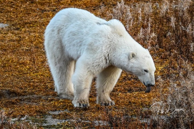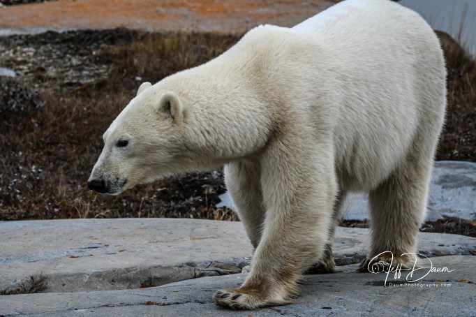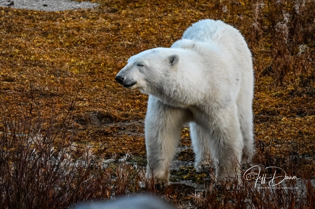 Shortly thereafter we spotted a Polar Bear again near the shore. Apparently we were more interesting than his search for seaweed or grass to eat and he started to amble over toward our vehicle. Because of their size, they don’t appear to be moving very fast, but in fact with his large stride he covered about a quarter of a mile (ok, since he was in Canada, he covered about 0.40 kilometers 😊) in just a few minutes.